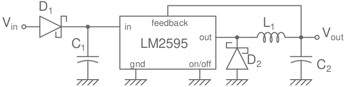 D1 : protège l'alimentation contre les inversions de polarité. Avec C1, elle peut aussi améliorer l'ondulation de la tension d'entrée Vin.