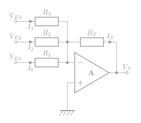 \[\mathsf{V_S=-R_S\left(\frac{V_1}{R_1}+\frac{V_2}{R_2}+\frac{V_3}{R_3}\right)}\]
