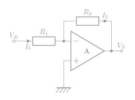 \[\mathsf{A_O =-\frac{V_S}{V_E}=-\frac{R_2}{R_1}}\]