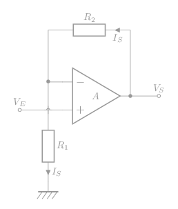 \[\bbox[5px,border:1px solid]{\mathsf{A_O=\frac{V_S}{V_E}=\left(1+\frac{R_2}{R_1}\right)}}\]