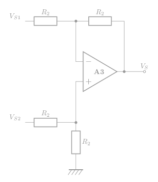 Nous remarquons le soustracteur déjà vu dans les lignes précédentes. Les résistances ayant toutes la même valeur, la tension de sortie: