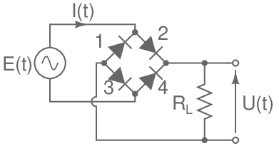 Lorsque la tension E(t) est positive, la diode(1) se bloque; le courant I(t) circule à travers la diode(2), la diode(4) se bloque à son tour, et ce courant passe dans la résistance RL, puis sort par la diode(3).