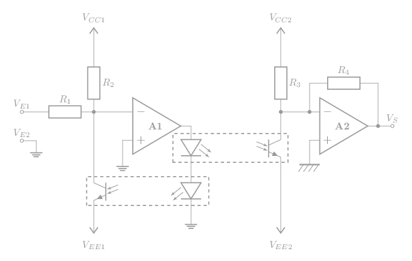 Ce type d' amplificateur repose sur un coupleur optique composé d'une diode et un phototransistor. Selon son schéma de principe, la non-linéarité du coupleur optique est compensée par un autre coupleur dit de référence.