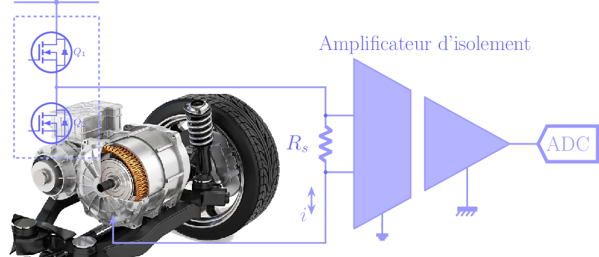 Ce montage présente le principe de mesure du courant consommé par un moteur électrique; RS est une résistance shunt connectée sur les entrées de l'mplificateur d'isolement, dont la sortie isolée est reliée à un convertisseur analogique numérique afin d'être traité par un dispositif intelligent.