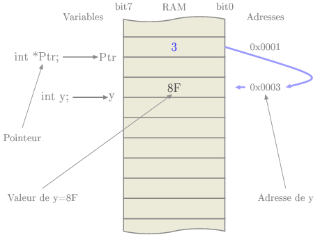 Ensuite on affecte à Ptr l’adresse de y (c'est à dire 5), puis l’instruction *Ptr = 0x30 ; affecte la valeur 0x30 au contenu de l’adresse pointée par Ptr.